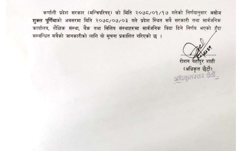 कर्णाली प्रदेश सरकारले कोजाग्रत पूर्णिमाका अवसरमा कार्तिक ३ गते प्रदेशभरि सार्वजनिक बिदा दिने निर्णय गरेको छ। कर्णाली प्रदेश सरकारको गत बैशाख १७ गतेको मन्त्रिपरिषद् बैठकको निर्णय अनुसार सार्वजनिक बिदा दिइएको हो।