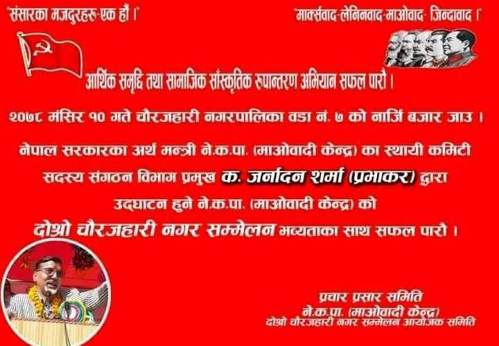 अर्थमन्त्री जनार्दन शर्मा(प्रभाकर) रुकुम पश्चिमको चौरजहारी आउनु हुने भएको छ । आउदो मंसिर १० गते शुक्रबार चौरजहारीमा आयोजना हुने दोस्रो नगर सम्मेलन उद्घाटनका लागि मन्त्री शर्मा चौरजहारी आउन लागेको नेकपा माओबादी केन्द्र रुकुम पश्चिमका जिल्ला सदस्य एवं दोस्रो नगर सम्मेलन आयोजक समितिका प्रचार प्रसार विभाग संयोजक खुम बहादुर खड्काले जानकारी दिनु भयो ।