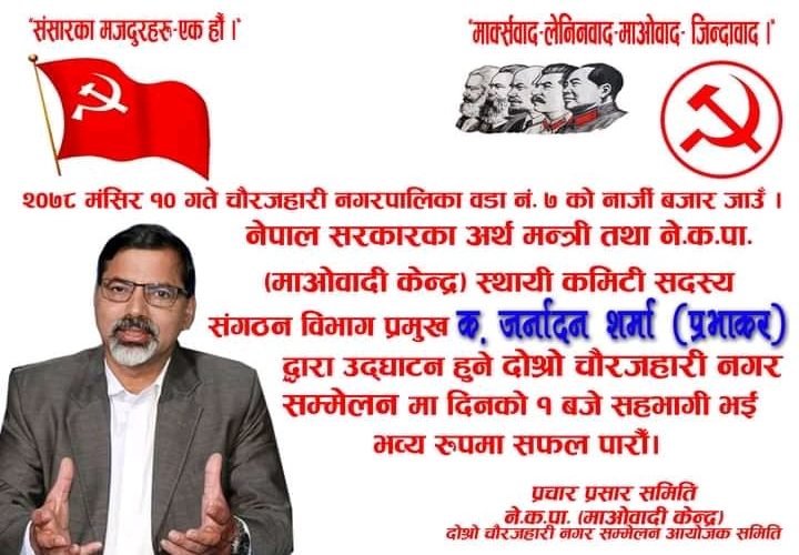 नेकपा माओबादी केन्द्रका संगठन बिभाग प्रमुख एवम् अर्थमन्त्री जनार्दन शर्मा (प्रभाकर) ले सबै पालिकामा पुगेर सम्मेलन उद्घाटन गर्ने कार्यक्रम तय भएको छ ।