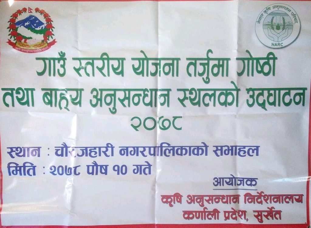 रुकुम पश्चिमको चौरजहारी नगरपालिकामा गाउँ स्तरीय योजना तर्जुमा गोष्ठी तथा बाह्य अनुसन्धान स्थलको उदघाटन कार्यक्रम सम्पन्न भएको छ। कृषि अनुसन्धान निर्देशनालय कर्णाली प्रदेश सुर्खेतको आयोजनामा चौरजहारी नगरपालिकको सभा हलमा उक्त कार्यक्रम सम्पन्न भएको हो ।