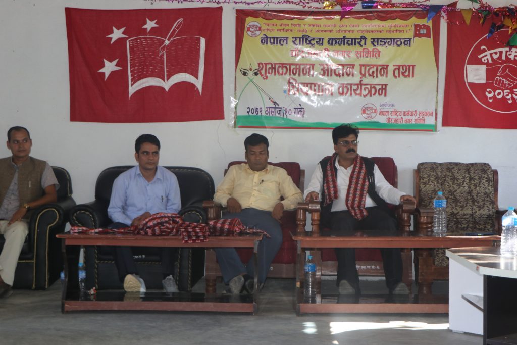नेपाल राष्ट्रिय कर्मचारी संगठन चौरजहारी नगर समितिको आयोजनामा सोमबार सुभकामना आदान प्रदान तथा चियापान कार्यक्रम सम्पन्न भएको छ । बिजया दशमी, शुभ दिपावली तथा छठ पर्वको अवसरमा चौरजहारी नगरपालिकाको सभाहलमा उक्त कार्यक्रम सम्पन्न भएको हो । संगठनका नगर अध्यक्ष डण्ड प्रसाद शर्माको अध्यक्षतामा भएको कार्यक्रमका नेपाल कम्युनिष्ट पार्टी (माओवादी केन्द्र) का केन्द्रिय सदस्य राजकुमार शर्माको प्रमुख आथित्यता रहेको थियो ।