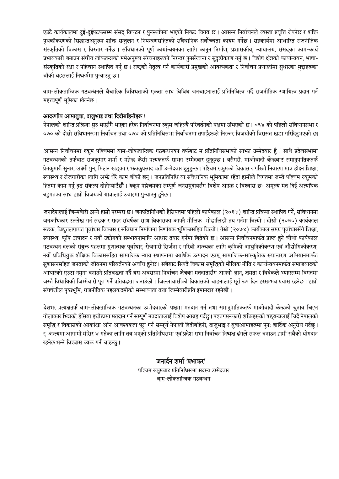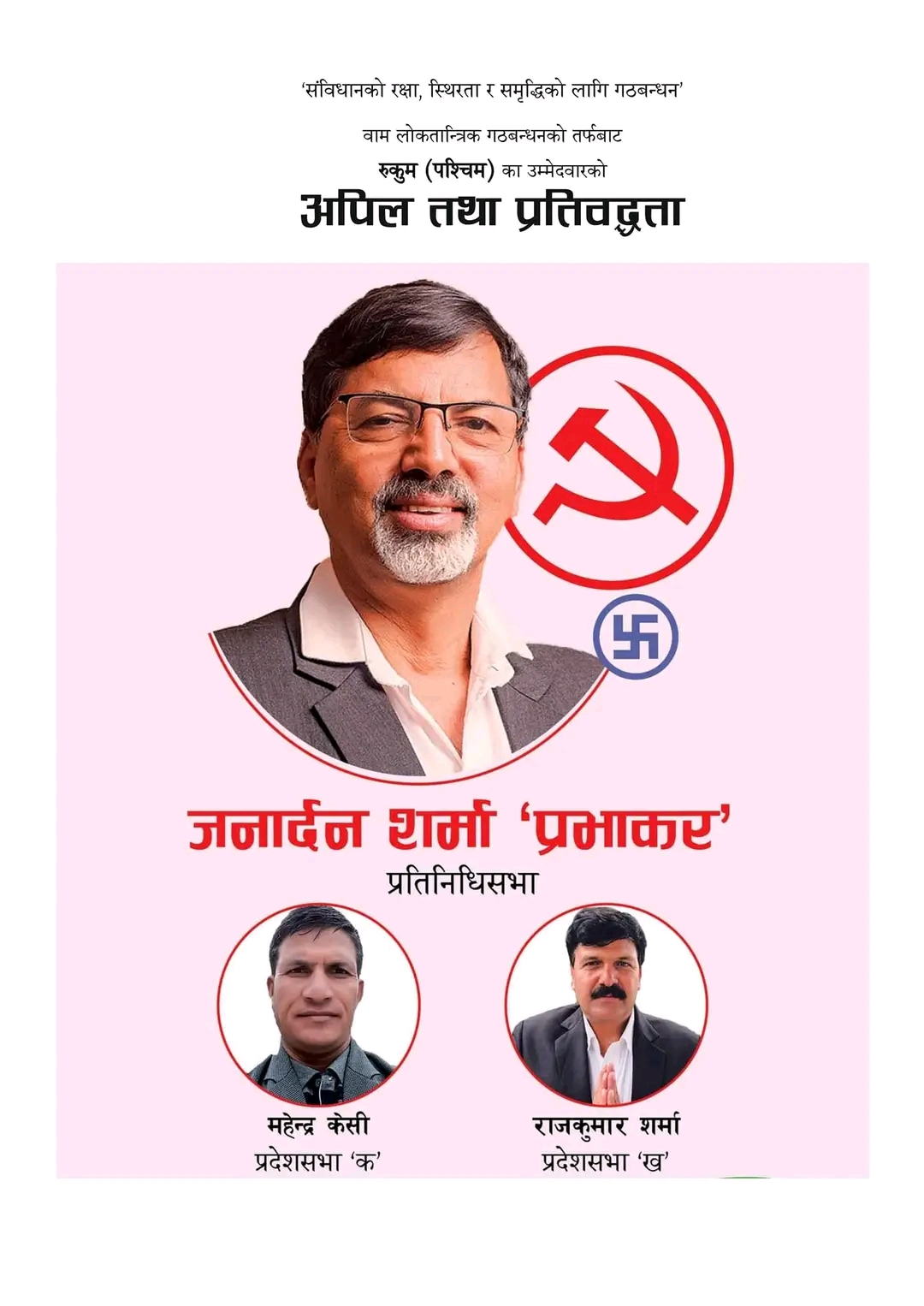 उम्मेदवारको तर्फबाट प्रतिनिधि सभा सदस्य उम्मेदवार जनार्दन शर्मा ‘प्रभाकर’ले प्रतिबद्धता पत्र सावर्जनिक गर्नुभयो । २०६४ पछि जिल्लामा भएको समग्र विकास र अवको ५ वर्षमा गर्ने कामहरु सहितको प्रतिवद्धता पत्र सार्वजनिक गरिएको हो । प्रतिवद्धता पत्र सार्वजनिक गर्दै शर्माले जनप्रतिनिधि वा संवैधानिक भूमिकामा रहँदा विगतमा जस्तै अव पनि रुकुमको हितमा काम गर्ने संकल्प गर्नुभयो ।