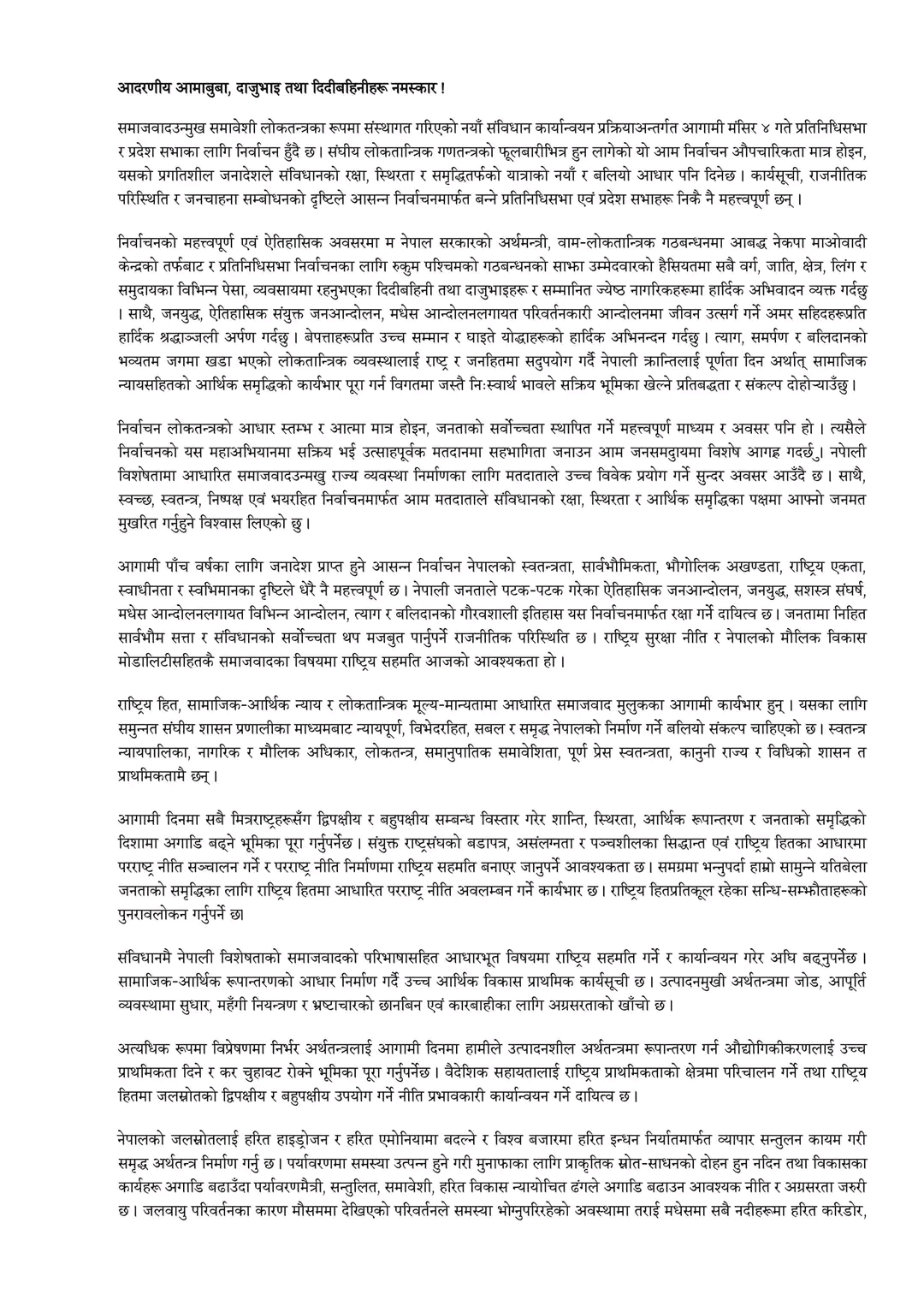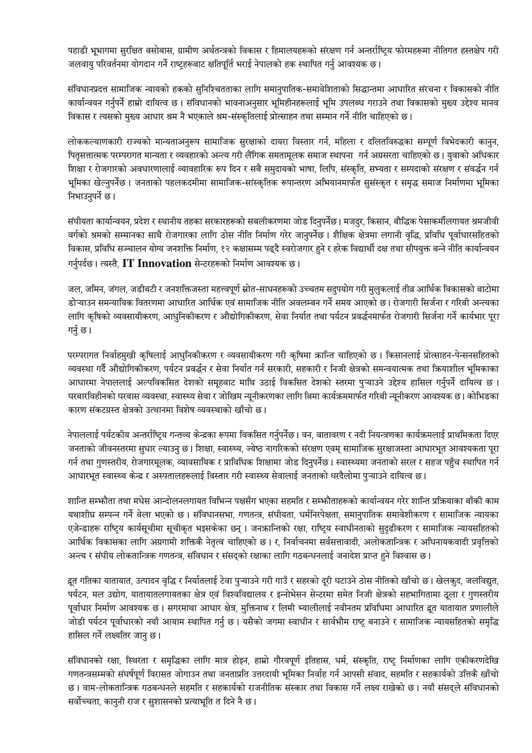 अव आसन्न निर्वाचन मार्फत प्राप्त हुने चौथो कार्यकाल गठबन्धन दलको संयुक्त पहलमा गुणात्मक पूर्वाधार, रोजगारी सृजना र गरिबी अन्त्यका लागि कृषिको आधुनिकिकरण एवं औद्योगिकरण, नयाँ प्रविधियूक्त शैक्षिक विकास सहित सामाजिक न्याय स्थापनामा आर्थिक उत्पादन एवं सामाजिक, सांस्कृतिक रुपान्तरण अभियान मार्फत सुशासन सहित जनताको जीवनमा परिवर्तनको अवधि हुने उहाँले प्रतिबद्धता व्यक्त गर्नुभयो ।