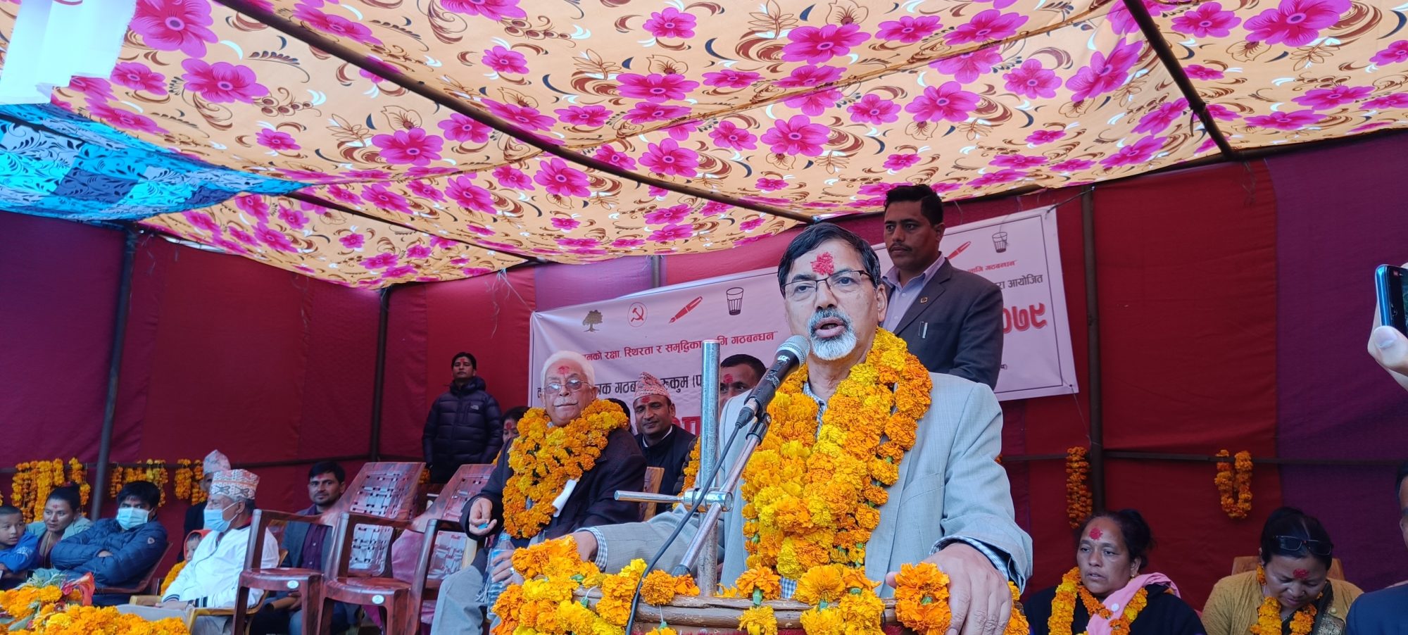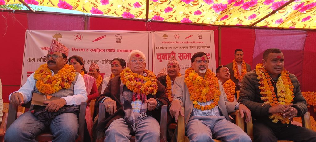 सभामा नेकपा माआवोदी केन्द्रका समानुपातिक तर्फ प्रतिनिधि सभा सदस्यका उम्मेदवार लक्ष्मी पुन लगायतका नेताहरुको पनि उपस्थिति रहेको थियो । सभालाई सम्बोधन गर्ने वक्ताहरुले प्रत्यक्ष तर्फ हसियाँ हथौडा र समानुपातिक तर्फ सम्बन्धित पार्टीको चुनाव चिन्हमा मतदान गरी गठबन्धनलाई विजयी गराउन आग्रह गरेका थिए ।