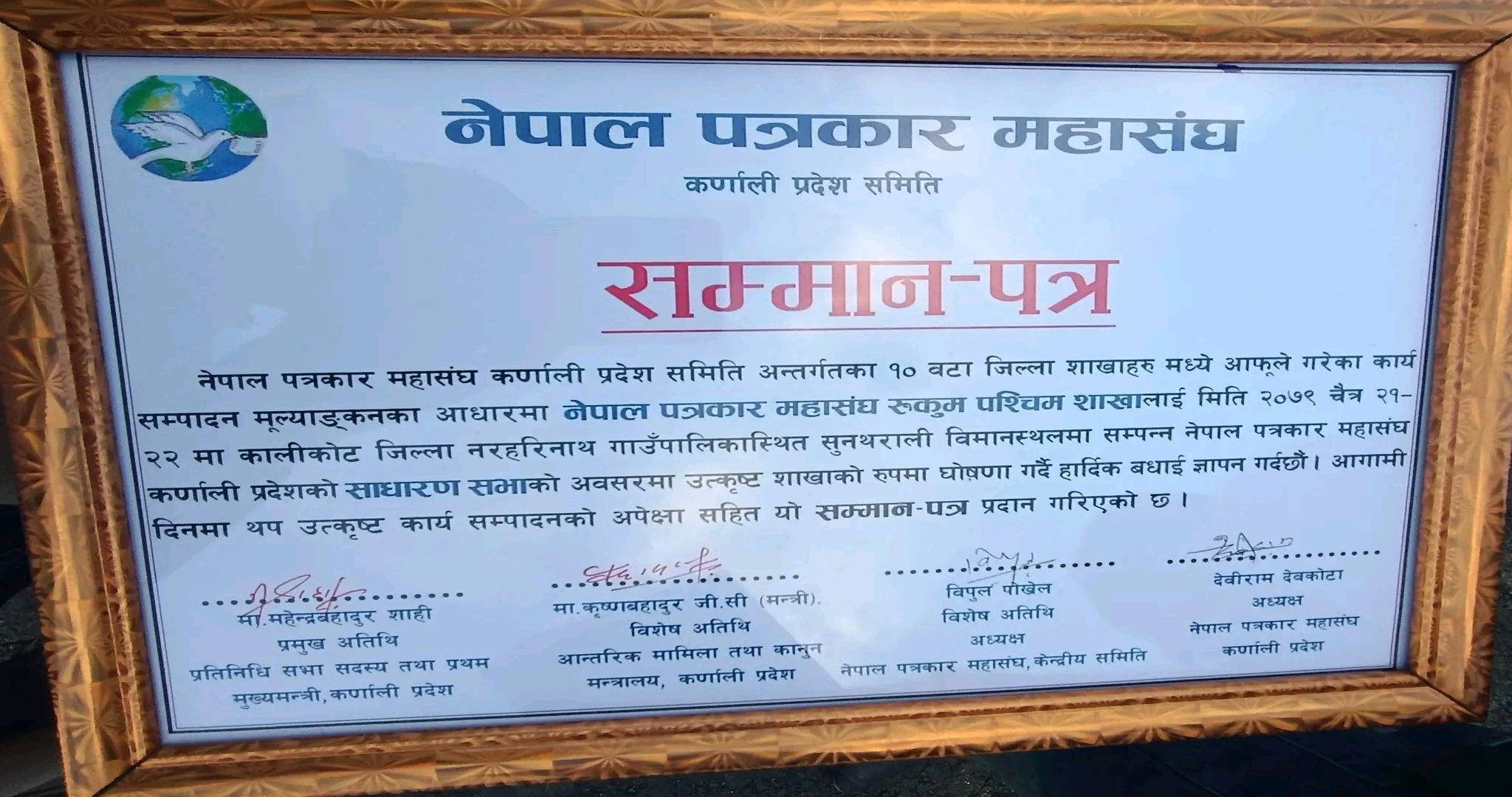 मंगलबार कालिकोट जिल्लाको नरहरिनाथ गाउँपालिकाको सुनथराली बिमानस्लथमा भएको नेपाल पत्रकार महासंघ कर्णाली प्रदेशको साधारण सभाको अवसरमा रुकुम पश्चिम शाखालाई सम्मान गरिएको हो ।