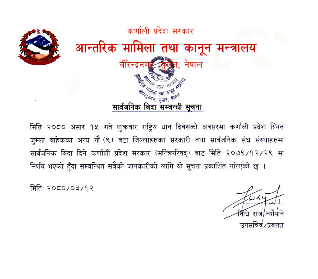 राष्ट्रिय धान दिवसको अवसरमा मिति २०७९ साल चैत २९ गते भएको निर्णय अनुसार कर्णाली प्रदेशका जुम्ला बाहेकका ९ जिल्लामा असार १५ गते शुक्रबार बिदा दिने निर्णय भएको आन्तरिक मामिला तथा कानुन मन्त्रालयले जनाएको छ ।