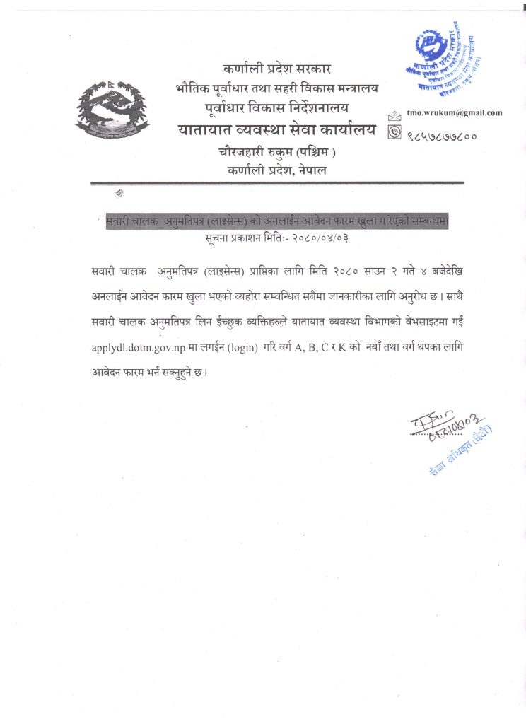 यातायात व्यवस्था सेवा कार्यालय रुकुम पश्चिम चौरजहारीबाट सवारी चालक अनुमति पत्र (लाईसेन्स) दिने प्रक्रिया शुरु भएको छ । कार्यालयले मंगलबारदेखि मोटरसाइकल, स्कुटी, अटोरिक्सा (टेम्पु), जीप, कार, डेलिभरी भ्यानको अनलाईन आवेदन फारम खुला गरेको हो । अब चौरजहारीबाटै सवारी चालक अनुमति पत्र (लाईसेन्स) पाउने भएपछि डोल्पा, जाजरकोट, रुकुम पश्चिम, सल्यानका सेवाग्राही प्रत्यक्ष लाभान्वित हुने छन् ।