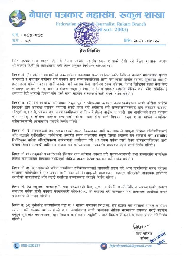 कोरोना महामारीका बेला पत्रकारहरुलाई विभिन्न स्वास्थ्य सामग्री सहयोग गर्ने विभिन्न निकायलाई धन्यवाद दिएको महासंघले आगामी दिनमा पनि सहयोगको अपेक्षा गरेको जनाएको छ । सचिव हिरा परियारले विज्ञप्ती जारी गरी महासंघको बैठकका निर्णयबारे जानकारी गराउनुभएको हो । विहीबार बसेको बैठकका निर्णय शुक्रबार सार्वजनिक गरिएको हो । महासंघले अदालती रिर्पोटिङका लागि अभिमुखिकरण गर्ने र रुकुम पूर्वमा पत्रकारिता तालिम सञ्चालनका लागि आवश्यक पहल गर्ने निर्णय समेत गरेको छ ।