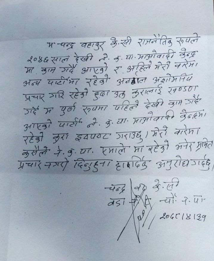 रुकुम पश्चिमको चौरजहारी नगरपालिका वडा नं. ८ का चन्द्र बहादुर के.सि ले राजनैतिक रुपले २०४६ साल देखि आफु नेकपा माओवादी केन्द्रमा नै रहेको बताउनु भएको छ । सामाजिक सञ्जालमा अन्य पार्टिमा लागेको भनि अनर्गल प्रचार गरिएको भन्दै विज्ञप्ति मार्फत खण्डन गर्नुभएको छ ।