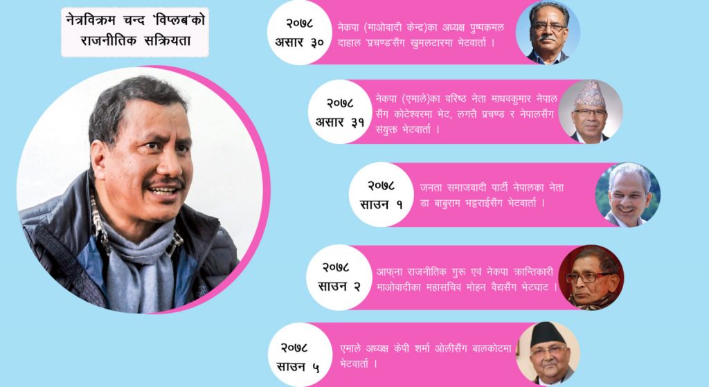 खुला राजनीतिमा आएपछि पनि झण्डै पाँच महिनासम्म ‘गुमनाम’ बनेका नेपाल कम्युनिष्ट पार्टीका महासचिव नेत्रविक्रम चन्द ‘विप्लव’ले पछिल्ला केही दिनयता राजनीतिक भेटघाटलाई तीव्र पारेका छन्।